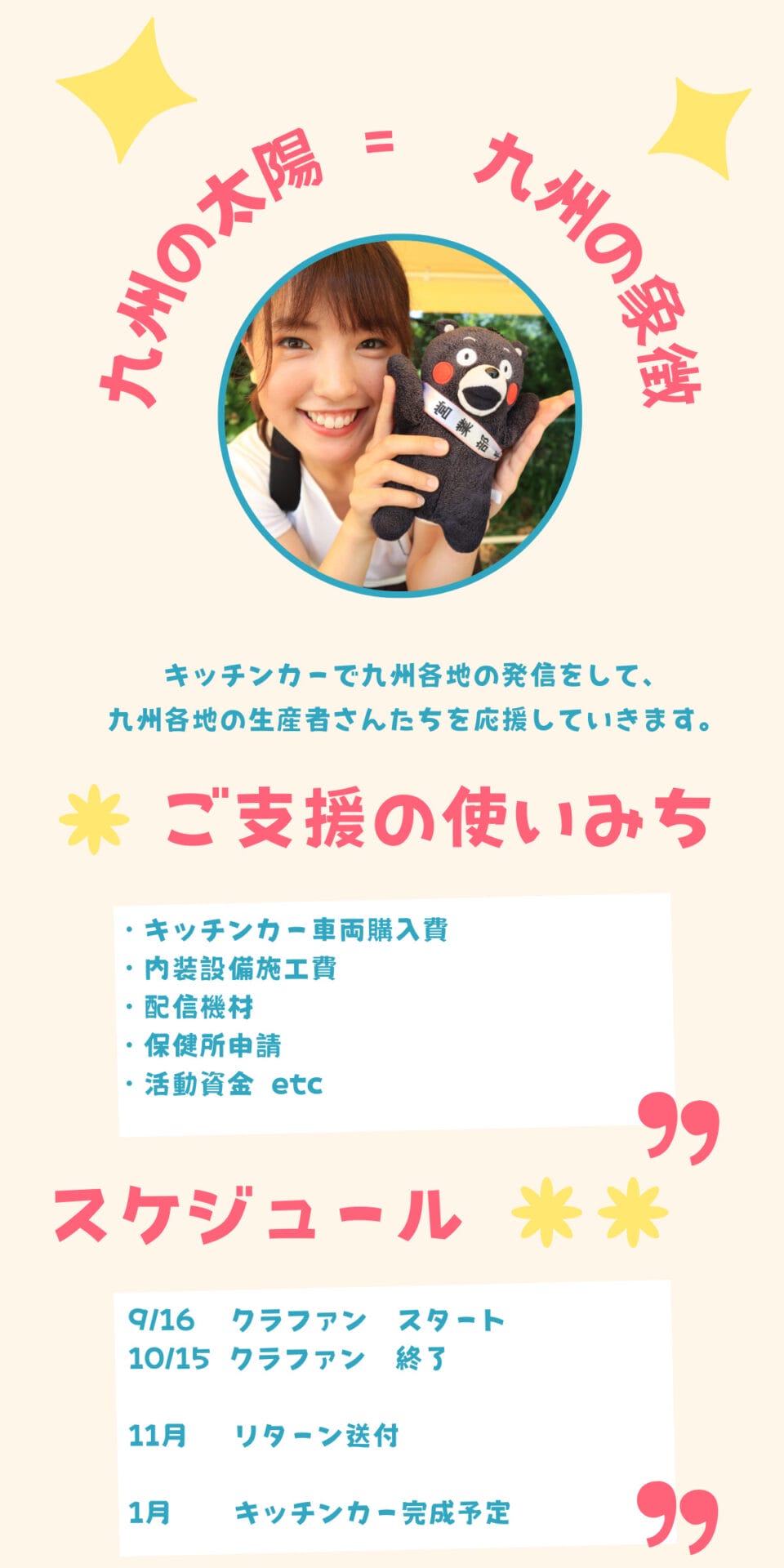 まずは私が「九州の太陽=九州の象徴」としてキッチンカーで九州各地の発信をして、九州各地の生産者さんたちを応援していきます。