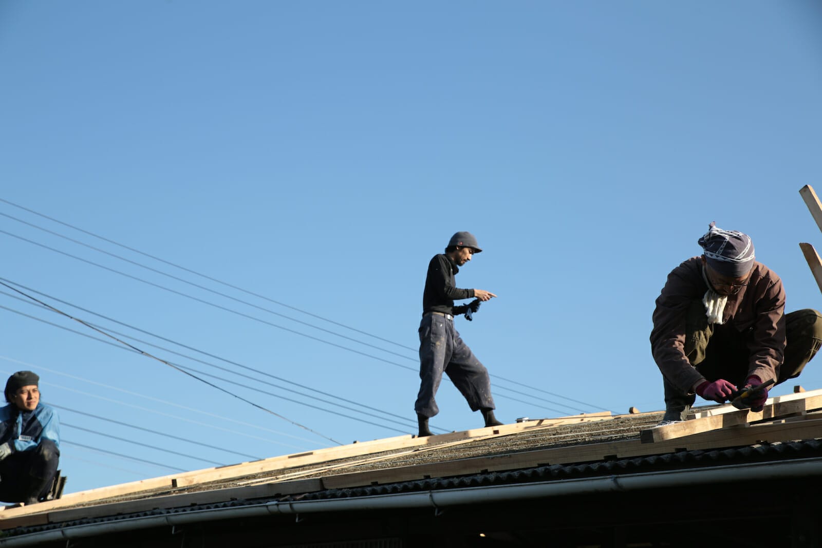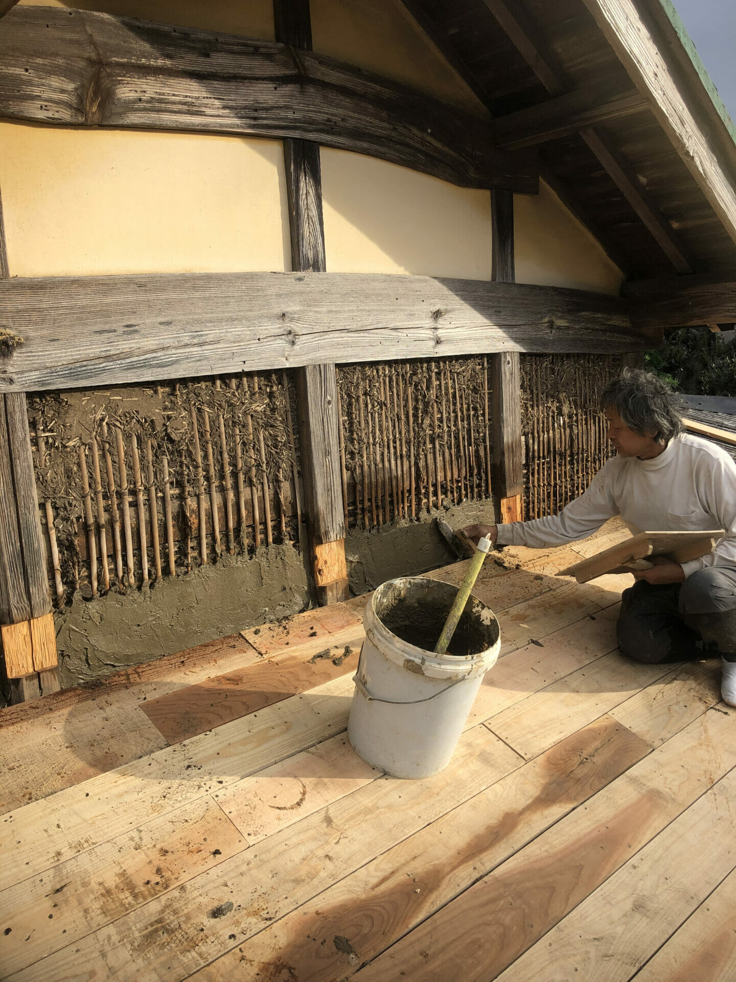 左官工事は「宮下左官」の宮下空氏が担います。左官技術を用いて、昔ながらの竹木舞下地の漆喰仕上げ壁と木材などの自然素材を組合せる事で、安易に全てを建て直すことはせずに、既存の躯体を活かしつつ、内部結露防止及び防カビ効果を持つ壁となる様に機能を付加します。