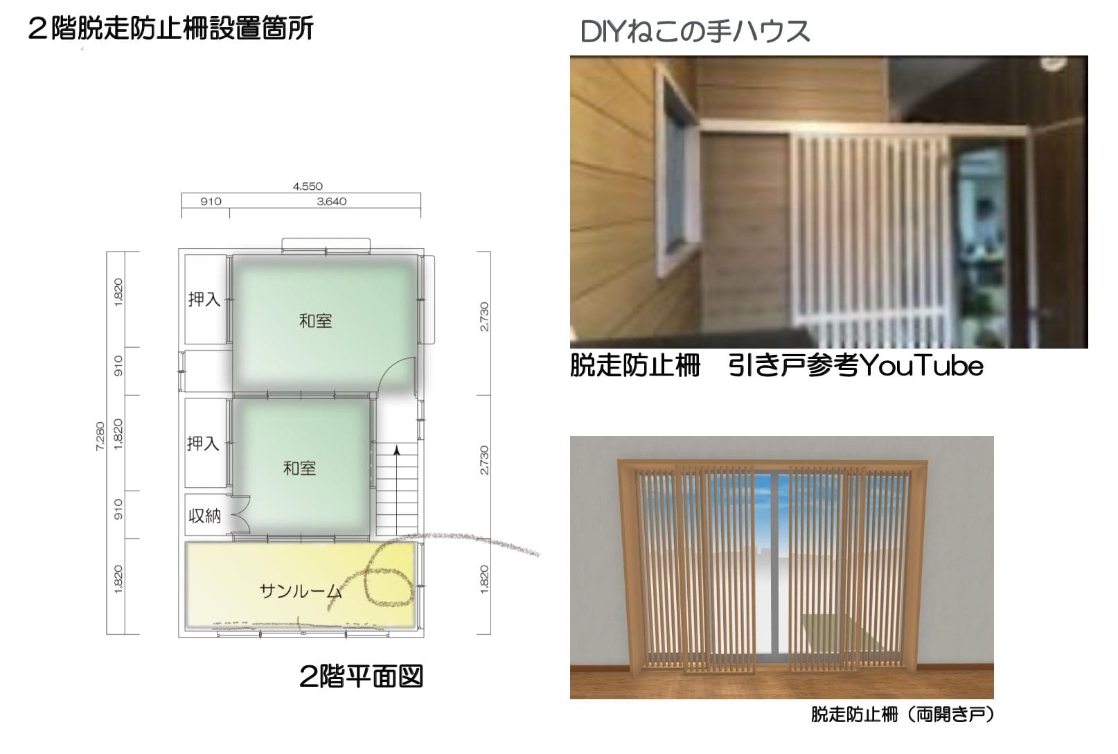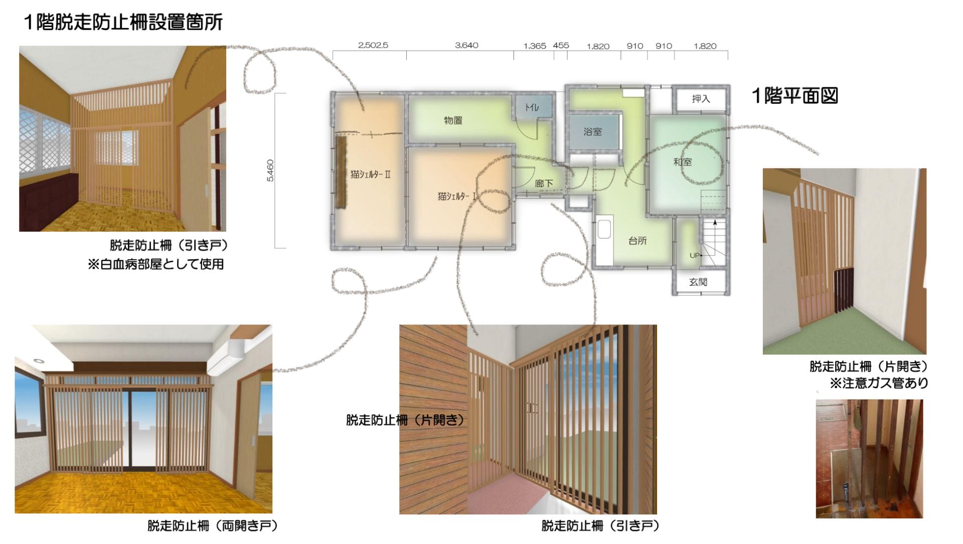 猫の保護施設に必要な隔離部屋をつくり、脱走防止柵を設置します。一般的な角材を使用し、木の温もりを感じる空間に。