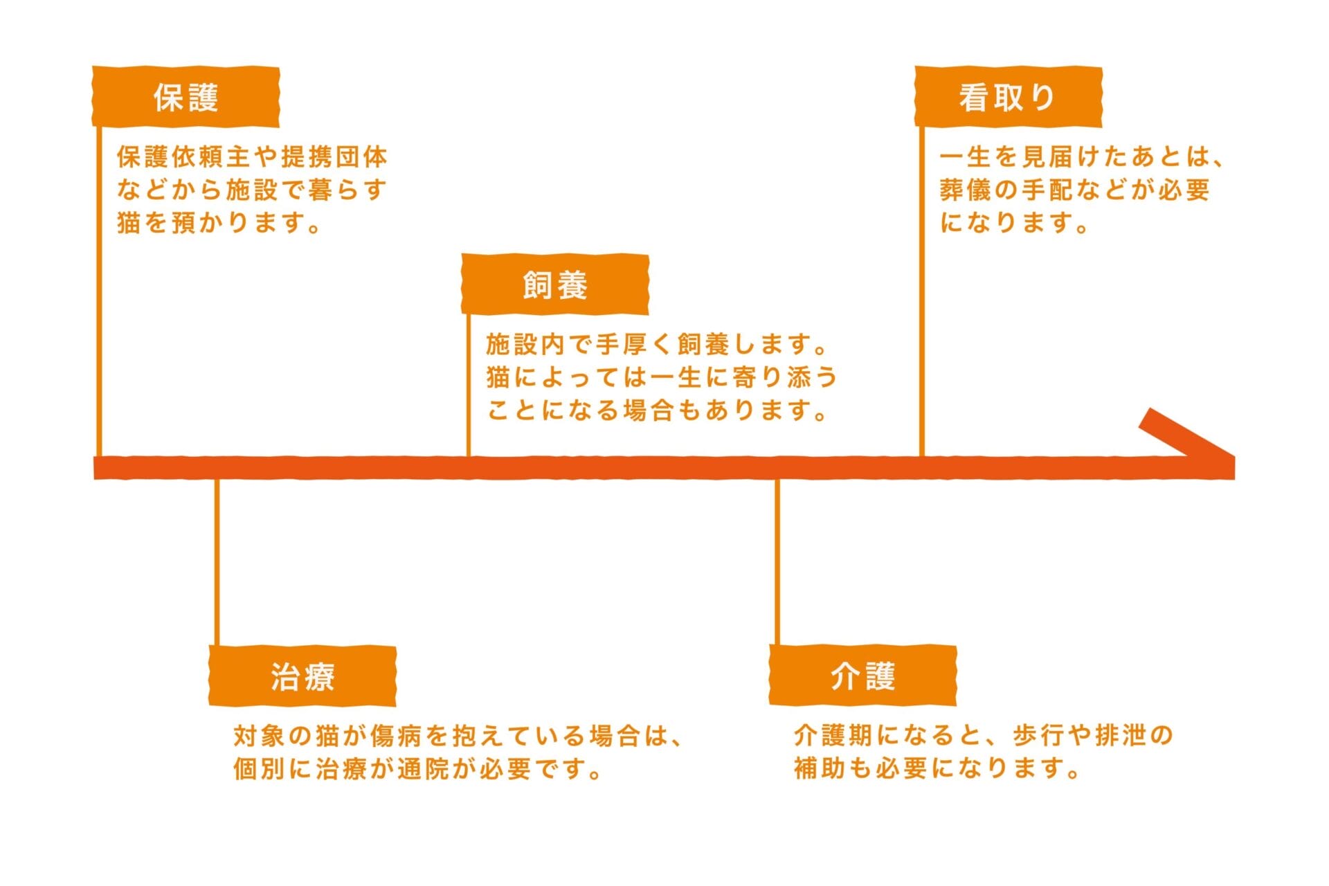 保護の対象は老猫であることが想定されるので、人間の介護同様に食事や排泄物の介助が必要になるケースが多くなります。また、数時間おきの看病や発作に対応するため、疾患の内容によってはスタッフが常駐する必要があります。